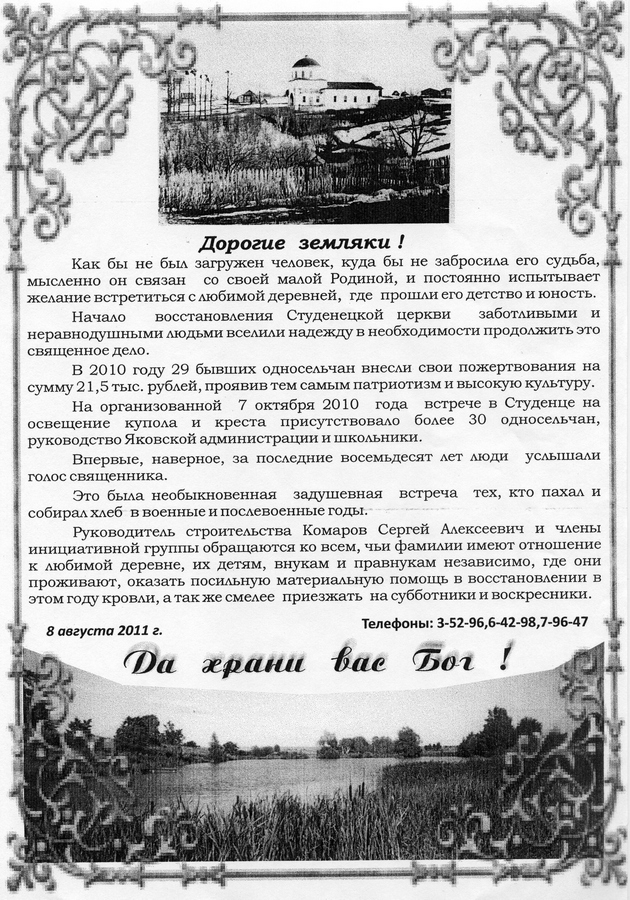 Это тексты, подготовленные местными краеведами-энтузиастами с целью привлечь желающих в помощь восстановления храма в Студенце: